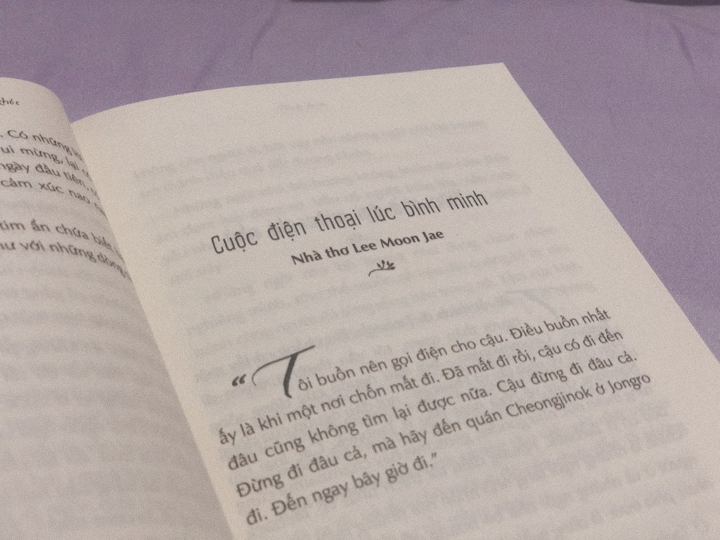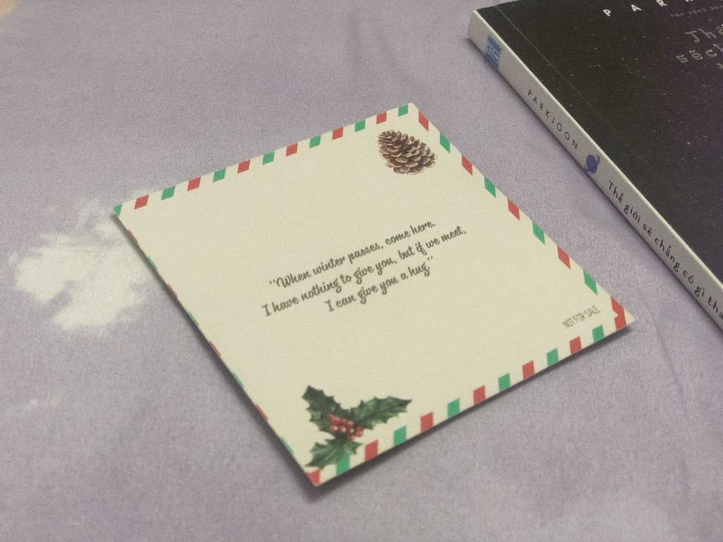Có mấy vần thơ đan xen cùng con chữ. Mình nghĩ rằng phiên bản tiếng Hàn nhìn sách sẽ rất đẹp. Mà bản tiếng Việt cũng đẹp vậy, nhìn tấm card đi kèm là thấy nội dung đẹp rồi.
