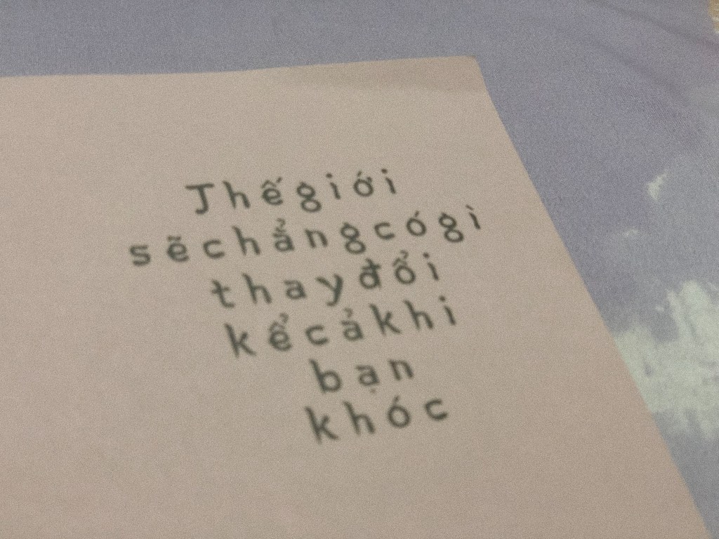 Để có những kỉ niệm đẹp nhất, hãy sống những khoảnh khắc trọn vẹn nhất. Cãi nhau cũng được, bỏ đi cũng được, nhưng đừng im lặng như thế, và luôn nhớ nếu đi thì hãy quay về. Thế giới đúng thật, chẳng có gì thay đổi khi bạn khóc. Chuyện cũng đã xảy ra rồi, khóc cũng như vậy, mà không khóc cũng như vậy. Cái sẽ thay đổi mọi thứ, là sau khi lau nước mắt xong mình sẽ làm gì tiếp theo. Là cố gắng sửa sai hay tha thứ và cho nhau một cơ hội mới? Là cất mọi thứ vào một chiếc rương kỷ niệm, hay ghi đè lên tấm băng màu xám ấy những sắc màu vui vẻ hơn? Là gì, thì cũng không sao cả. Nỗi buồn, cũng chỉ là nỗi buồn mà thôi.