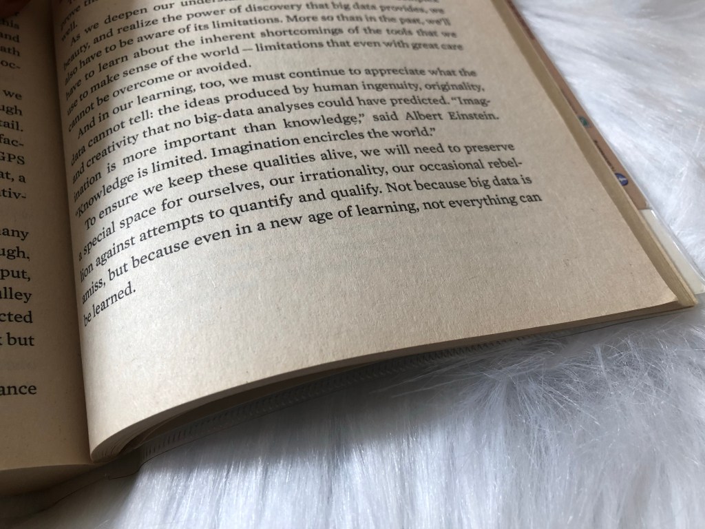 Vốn dĩ rất yêu thích con số và cũng có cơ hội làm việc với một lượng data nhỏ ở công ty, mình đã tìm đến cuốn sách này như thế. Vì sách ngoại văn thường khá mắc tiền, mình lựa chọn dùng dịch vụ của Libri – nơi mọi người có thể thuê sách ngoại văn với mức giá ổn và quan trọng là tủ sách khá có gu. Hơn nữa, mình phải công nhận rằng lúc nghĩ tới số tiền đã bỏ ra để đăng ký gói theo năm, mình bắt đầu có động lực để cầm cuốn sách lên đọc hơn. Vậy mà cũng ròng rã mất vài tháng mới xong cuốn này, một phần vì chủ đề không phải cái bạn có thể thức khuya hay đọc liền vài tiếng liên tục. Big data dù viếtt rất dễ hiểu nhưng nó đang nói về một phạm trù mang tính học thuật một chút, có vẻ thích hợp nếu bạn tìm một phương thức chữa bệnh mất ngủ lúc này. Bên cạnh đó thì chữ của sách khá nhỏ, một trang sách bằng gấp đôi lượng từ của những cuốn sách khác. Có lẽ điều quan trọng nhất là kỹ năng đọc của mình còn đang cần tập chạy để lấy đà.