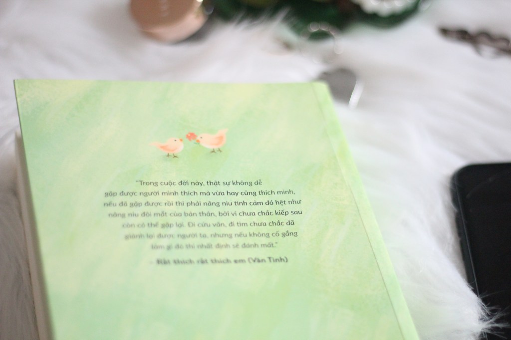 Rất thích rất thích em lại khác một chút, mình thích câu chuyện bắt đầu của cuốn sách. Một ngày hai vợ chồng chị về thăm lại trường đại học và chị Vãn Tình đã cảm ơn anh vì đem lại cho chị những kỷ niệm mới và vui vẻ với ngôi trường này. Anh ấy đã nhìn thấy đôi mắt lấp lánh của chị khi kể về từng kỷ niệm gắn với từng góc ngôi trường, nên anh ấy đã nói rằng nếu em thích như vậy, sao không viết một cuốn tiểu thuyết về nó. Mình tin rằng độ ngọt ngào của cuốn sách bắt nguồn từ đây, khi chị may mắn tận hưởng hạnh phúc bên một người luôn ủng hộ và khích lệ mình như vậy.