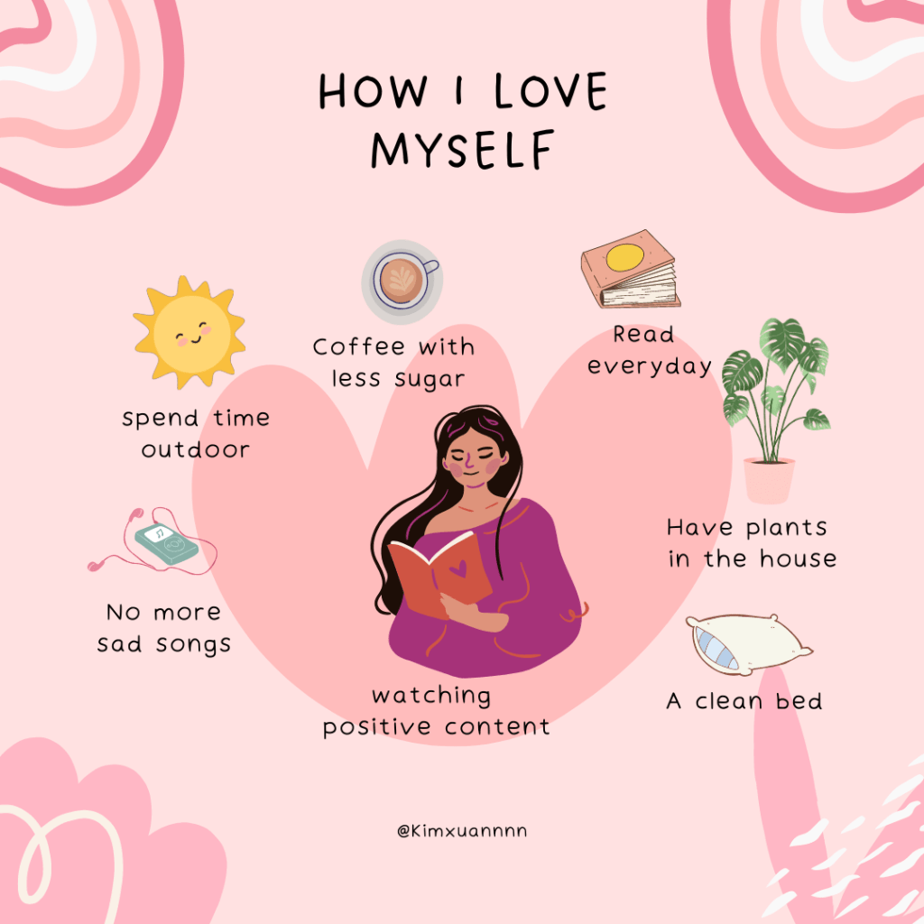 Những việc nhỏ bé như dọn dẹp căn phòng để tâm trí thoải mái hơn, dọn rác thay vì để tích tụ lại, giữ cho căn phòng có hương thơm, thói quen tốt là đi tập thể dục và đi ngủ sớm, đọc sách mỗi ngày, … mình thấy vui hơn khi tưởng tượng ra những viễn cảnh xinh đẹp, dần dần biến cuộc sống của mình trở thành viễn cảnh xinh đẹp đó, và đó là cách khiến yêu bản thân càng ngày càng dễ dàng hơn.