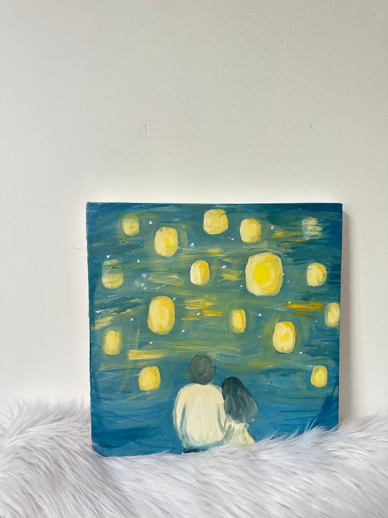 Mình có đang nằm mơ không, khi mà bức tranh mình đã từng vẽ vào ngày một tháng một, bốn năm về trước, giờ đây đã thực sự trở thành sự thật. Trong bức tranh là một đôi trai gái, cô gái có mái tóc đen dài, mặc một chiếc váy rất xinh, bên cạnh là chàng trai mặc áo trắng. Cả hai khoác vai nhau nhìn những chiếc đèn trời được thả lên, mang theo đó là những ước nguyện của họ, bay lên trời cao. Cô gái đó là mình, đây là sự thật rồi, mình cảm thấy quá đỗi hạnh phúc, mình muốn giây phút ấy kéo dài mãi mãi.