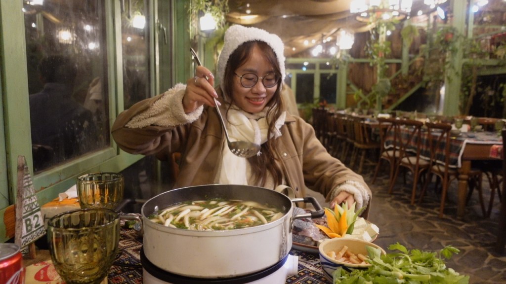 Ghé vào Cloud Forest, mình thấy thích thú vì sự lãng mạn và tinh tế, có nét cổ điển nhưng vẫn rất ấm áp, và mình đã có một bữa lẩu ấm nóng rất ngon miệng. Ở đây còn bán cả thịt nướng ngay khuôn viên ngoài vườn, trông lãng mạn đến mức có thể cầu hôn ở đây và không sợ bị từ chối, và mình sau khi ăn no căng bụng, mua thêm một cốc trà sữa nóng về homestay xem phim. Trên đường về, mình còn kịp ghé mua hạt dẻ nóng, và buổi tối ở Tà Xùa khép lại ấm áp với túi hạt dẻ dẻo bùi, một bộ phim Giáng Sinh, cốc trà sữa nóng, và nệm có sưởi ấm.